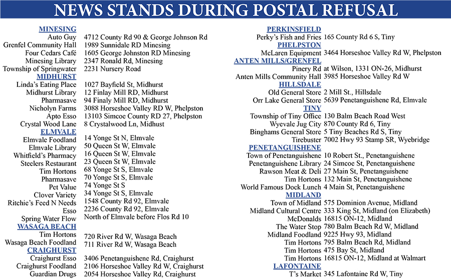 We print 20,000 newspapers once every two weeks. 18,780 are mailed out by Canada Post to post office routes in the Barrie area (3050), all of southern Springwater Township (4320), all of Minesing/Anten Mills (130), all of Grenfel and Utopia (750), all of Phelpston (620), all of Hillsdale (630), all of Elmvale (2550), all of Wyebridge (260), all of Wyevale (975), all of Perkinsfield (1275), the Rural Routes 1 and 2 of Midland (1100), and the Rural Routes of Penetanguishene that go into Tiny Township (2900) papers. We have 150 subscriptions across Canada.